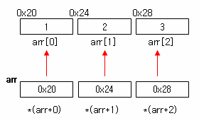 위의 예에서 제시된 int 형 배열 arr 은 0x20 번지부터 4byte 씩 증가하는 연속된 메모리 공간에 값이 저장되는