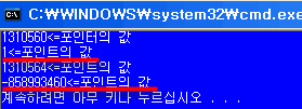 포인팅 주소를 변경하기 전에는 int i =1 이었던 놈을 여전히 포인팅 하고 있고 변경 후에는 이상한 값이 나왔다.