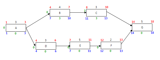 참고로 위 표에서 CP는 A->D->E->F->G 이며 프로젝트 총 소요시간은 18일이 된다