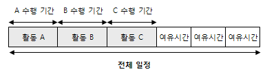 다음과 같이 전체 일정안에서 각 활동을 수행하는 기간에 여유시간이 포함되어 있을 경우
