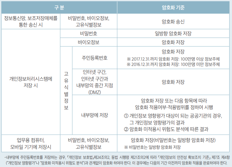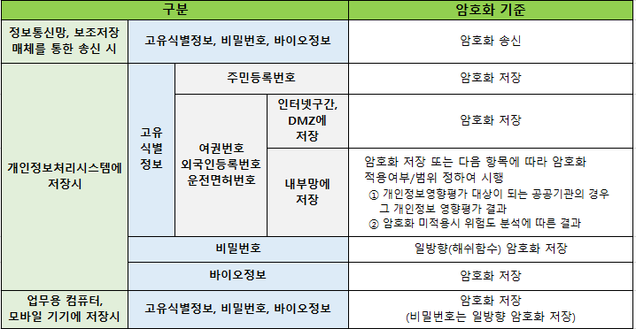 글로 나열된 법 조문으로는 한눈에 들어오지 않는다. KISA(한국인터넷진흥원)에서 발간한 '개인정보의 암호화 조치 안내서'의 요약표를 옮겨 보았다.