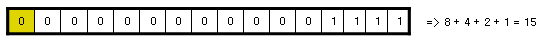 아래는 short 형 수 15 가 저장된 메모리 구조입니다 ( 노란색 비트는 부호비트 입니다)