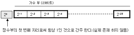 (단정도 부동소수의 경우 23비트로 가수부를 표현하는데 첫번째 자리 1이 생략되었다고 할 수 있으므로 총 24비트